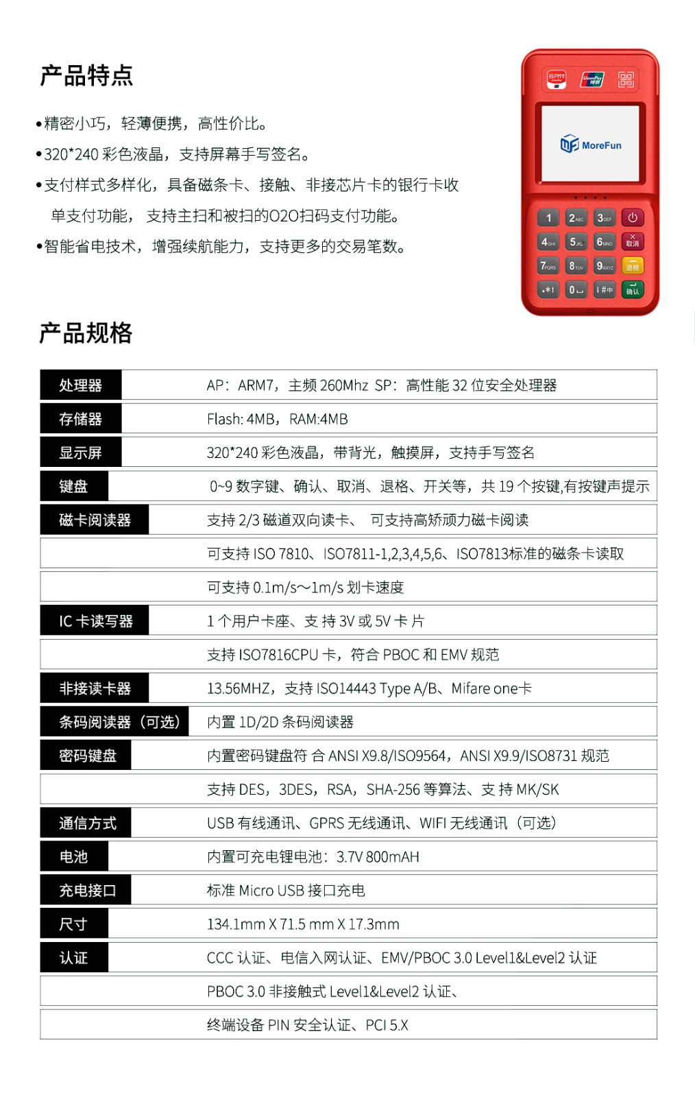 32位高性能ARM11安全CPU;整机通过业内更先进的PCI PED4.X 安全认证及国内受理终端PIN输入设备安全评估检测认证,多项措施保障金融交易的安全;